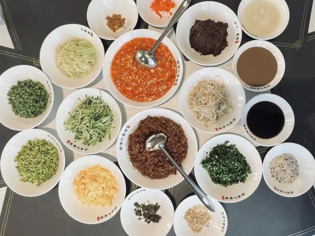 临清什香面不仅能满足人们的味蕾,更是一场视觉与文化的交融。十种菜样、八种调料配上一碗面所营造的仪式感,堪称独一无二。品尝过程宛如一场精心编排的戏剧:小碗调味料如配角先行登场,咸菜、炒菜紧随其后,整齐排列于餐桌边沿;最后,整盆面条与肉素卤作为主角。放眼望去,满桌色彩斑斓,未及品尝已令人垂涎。五颜六色的菜肴构成一幅流动画卷,生动诠释着运河文化的包容与多元。