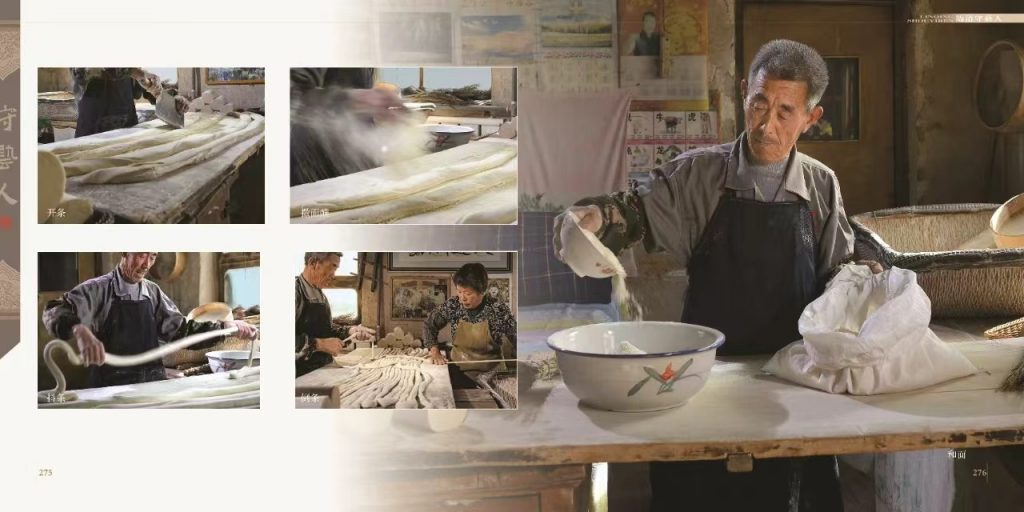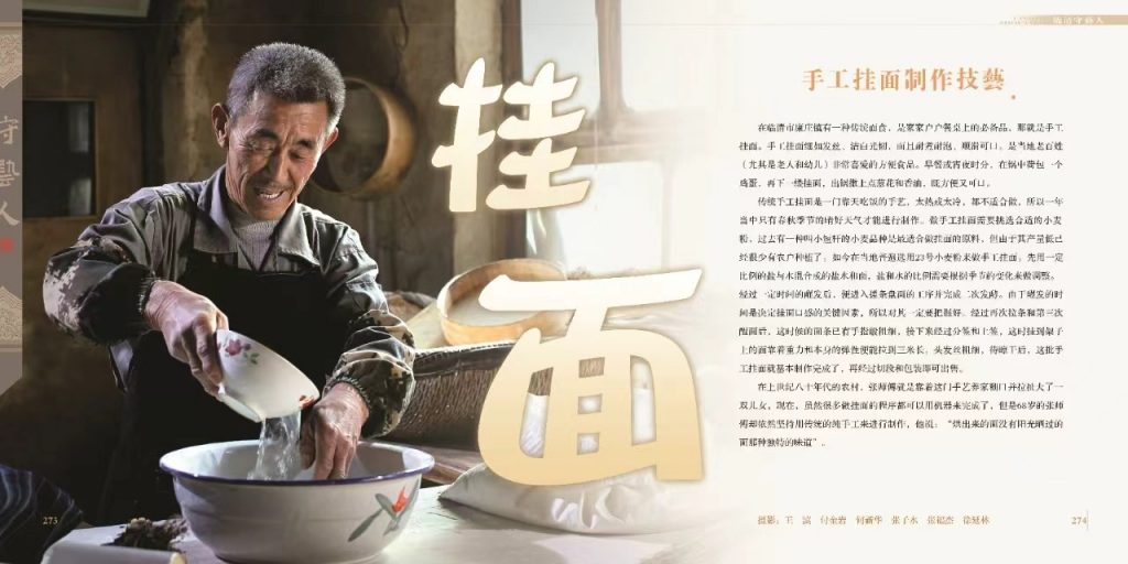 传统手工挂面是一门靠天吃饭的手艺,太热或太冷,都不适合做,所以一年当中只有春秋季节的晴好天气才能进行制作。做手工挂面需要挑选合适的小麦粉,过去有一种叫小短秆的小麦品种是最适合做挂面的原料,但由于其产量低已经很少有农户种植了。如今在当地普遍选用23号小麦粉来做手工挂面。先用一定比例的盐与水混合成的盐水和面,盐和水的比例需要根据季节的变化来做调整。经过一定时间的醒发后,便进入搓条盘面的工序并完成二次发酵。由于醒发的时间是决定挂面口感的关键因素,所以对其一定要把握好。经过再次拉条和第三次醒面后,这时候的面条已有手指般粗细,接下来经过分签和上签,这时挂到架子上的面靠着重力和本身的弹性便能拉到三米长,头发丝粗细,待晾干后,这批手工挂面就基本制作完成了,再经过切段和包装即可出售。图片