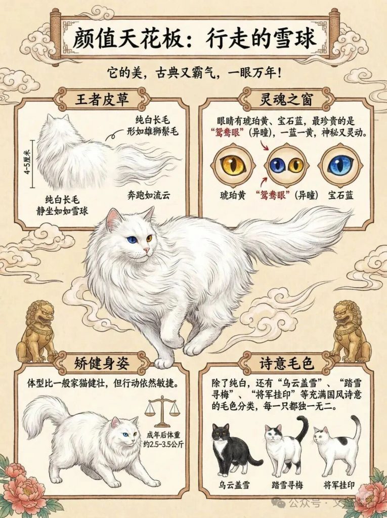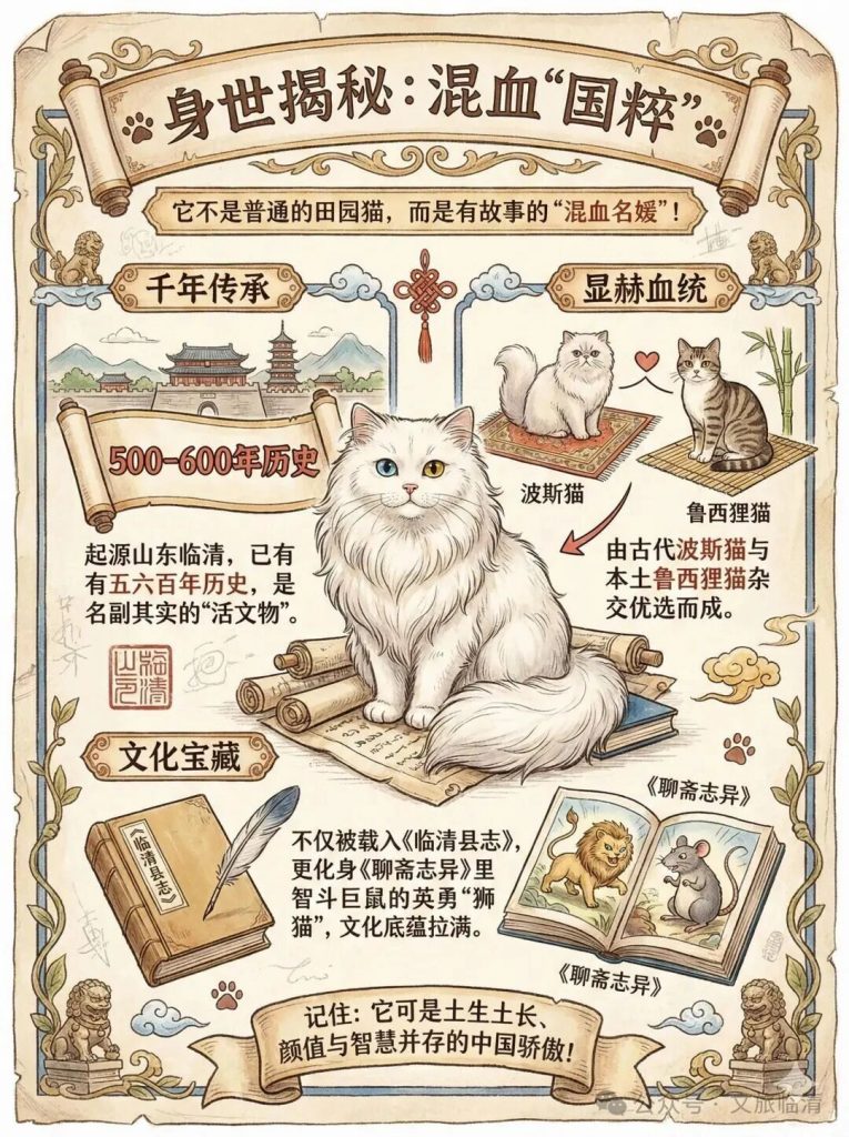 在临清,还有一种可爱的“小精灵”——狮猫。它是古代丝绸之路文化交融的结晶,毛发柔密如雪,双眼常呈异色,或蓝或黄,澄澈灵动,憨萌娇俏的模样自带灵气。